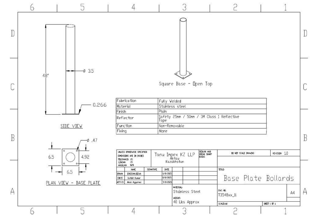 Usage: Base Plate Bollards are sturdy, vertical posts typically used for traffic control, security, and pedestrian safety. They serve as protective barriers to prevent vehicle access in sensitive areas, such as sidewalks, building entrances, and parking lots. Bollards are also used to guide traffic and mark boundaries without obstructing pedestrian movement. Tanu Impex Bollards are available in various designs that offer both functionality and aesthetic value, The Base plate bollards are commonly used indoors and on multi-floor installations where digging in the ground is not possible. This can be supplied open top, flat-top, or cape-top. When suppling open top, the customer can customize the cap to their choice including with cast and machined tops By default, these are shipped with a plastic cap.